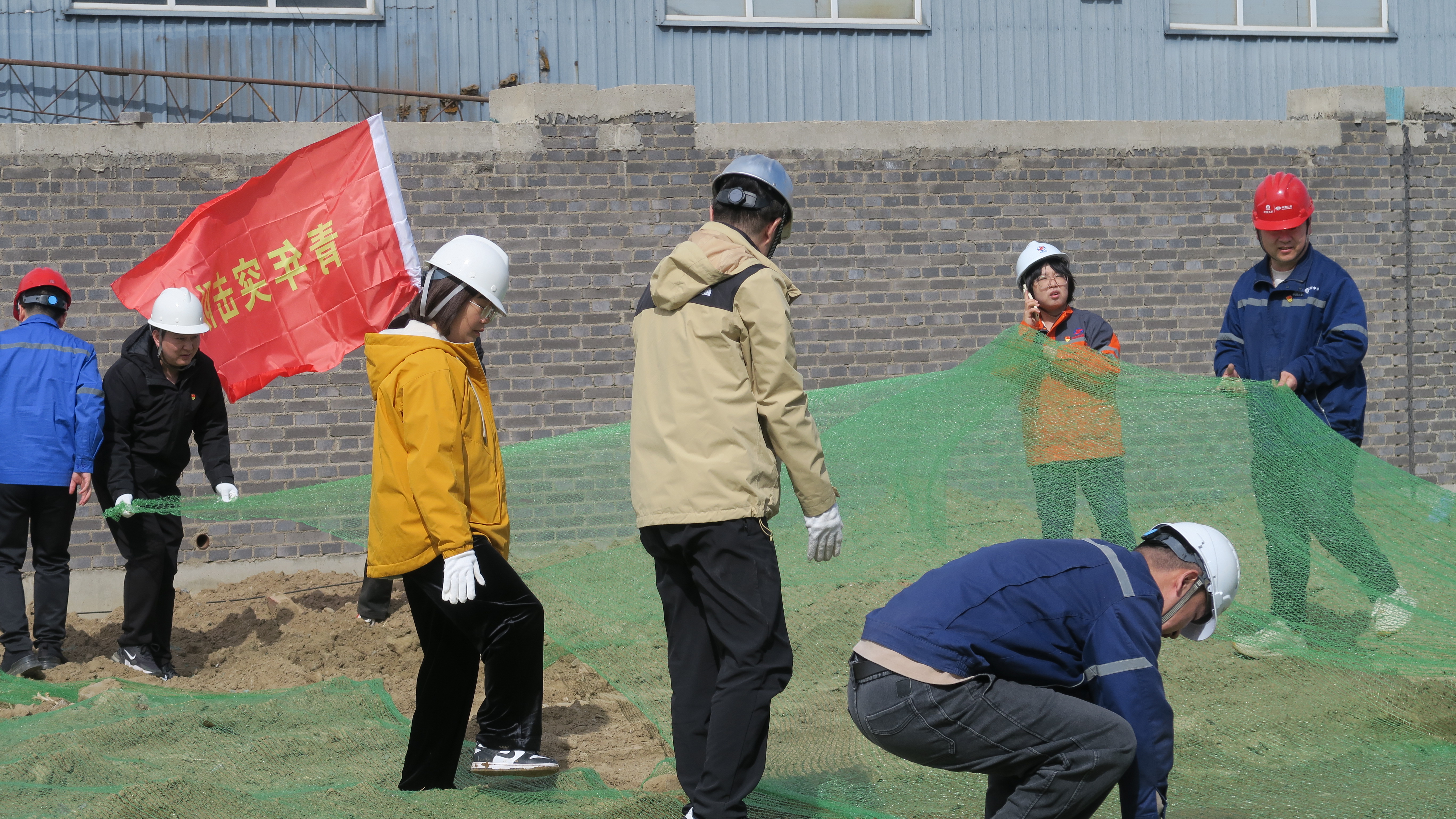 志愿先行,擦亮黨員底色。活動最后,黨員突擊隊、青年突擊隊帶頭深入施工現場開展“黨員先鋒行動”,重點對裸露土方進行覆土作業并鋪設密目式安全網,以實際行動推進揚塵治理,助力綠色文明施工。突擊隊隊員們沖鋒在前、分工協作,鮮艷的旗幟在施工一線高高飄揚。黨員突擊隊發揮先鋒模范作用,青年突擊隊彰顯生力軍力量,大家用實干詮釋初心,以擔當踐行使命,展現了新時代建設者的先鋒本色。