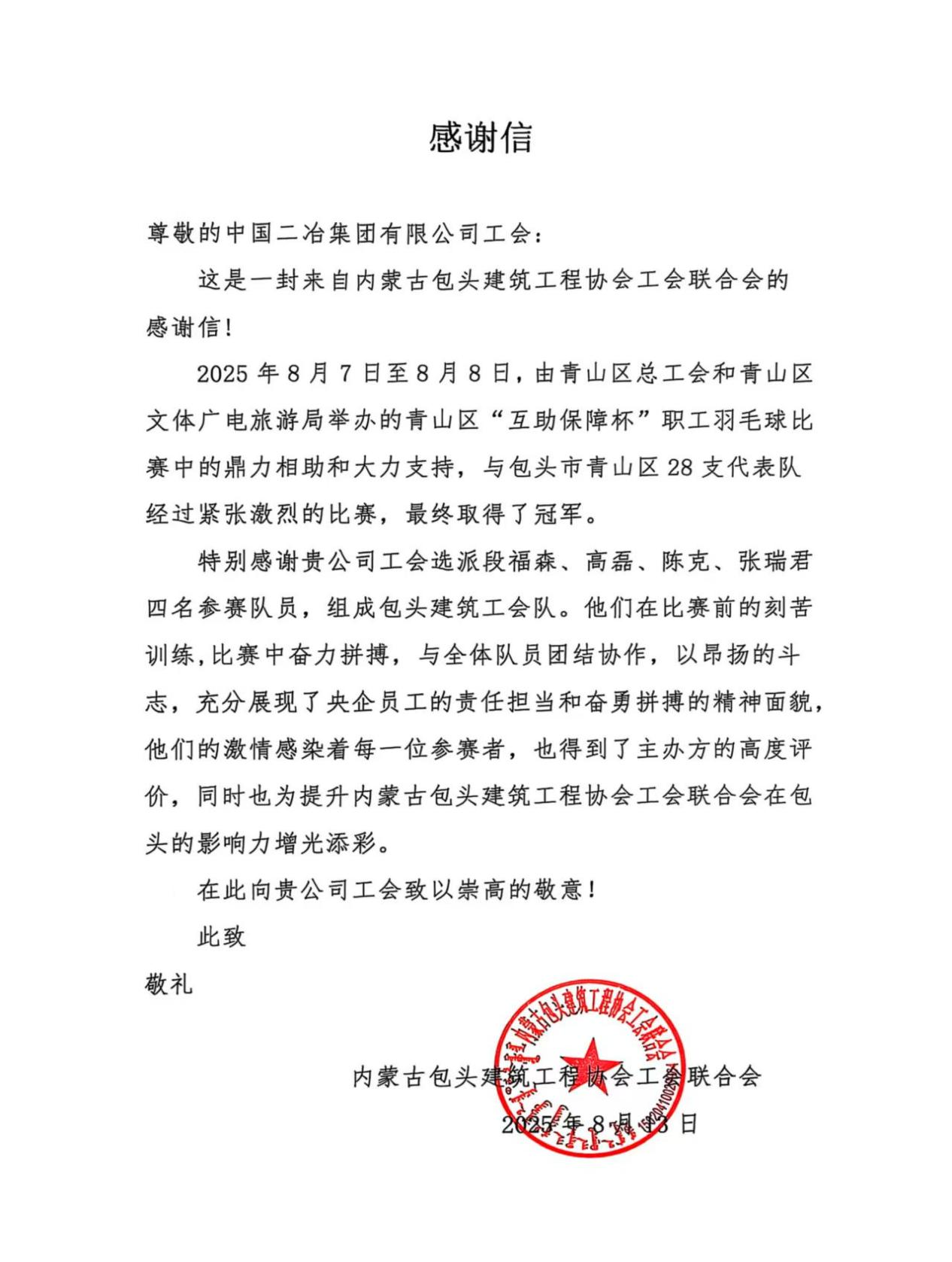 信中指出,8月7日至8日,由青山區總工會和青山區文體廣電旅游局舉辦的青山區“互助保障杯”職工羽毛球比賽在一機體育館舉行,由中國二冶工會選派的段福森、高磊、陳克、張瑞君等四名同志組成的包頭建筑協會代表隊,經過艱苦拼搏,在28支代表隊中脫穎而出,榮獲了團體冠軍。