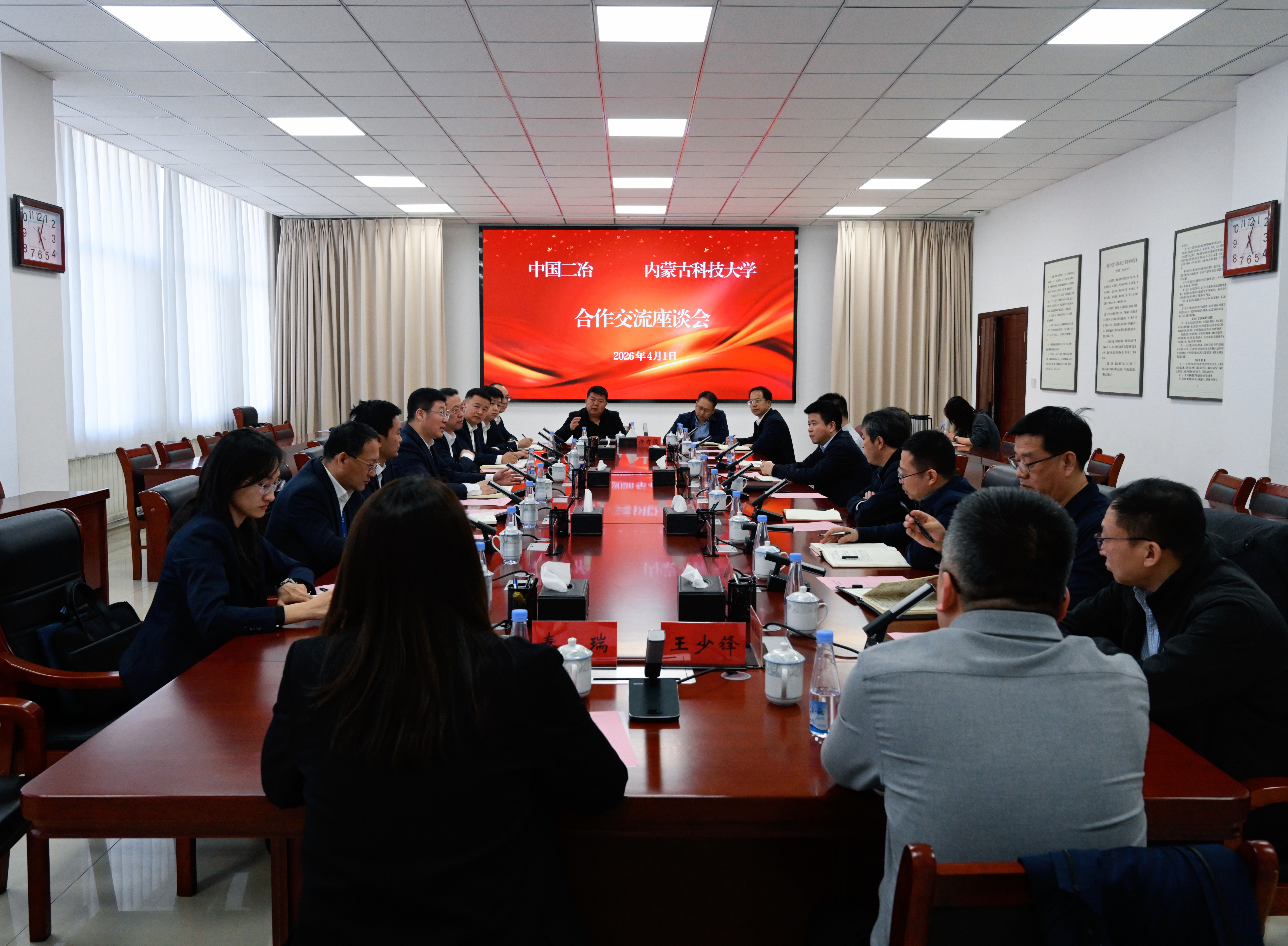 內蒙古科技大學校長助理劉承,相關學院院長、處室處長劉小勇,曹釗,張永強,高峻峰,劉文,王少鋒,許有俊,王文明,秦瑞;中國二冶總部部門及二級公司負責人高盟、趙力欣、王志義、李曉明、韓慧超、尹力、李國強等參加會談。